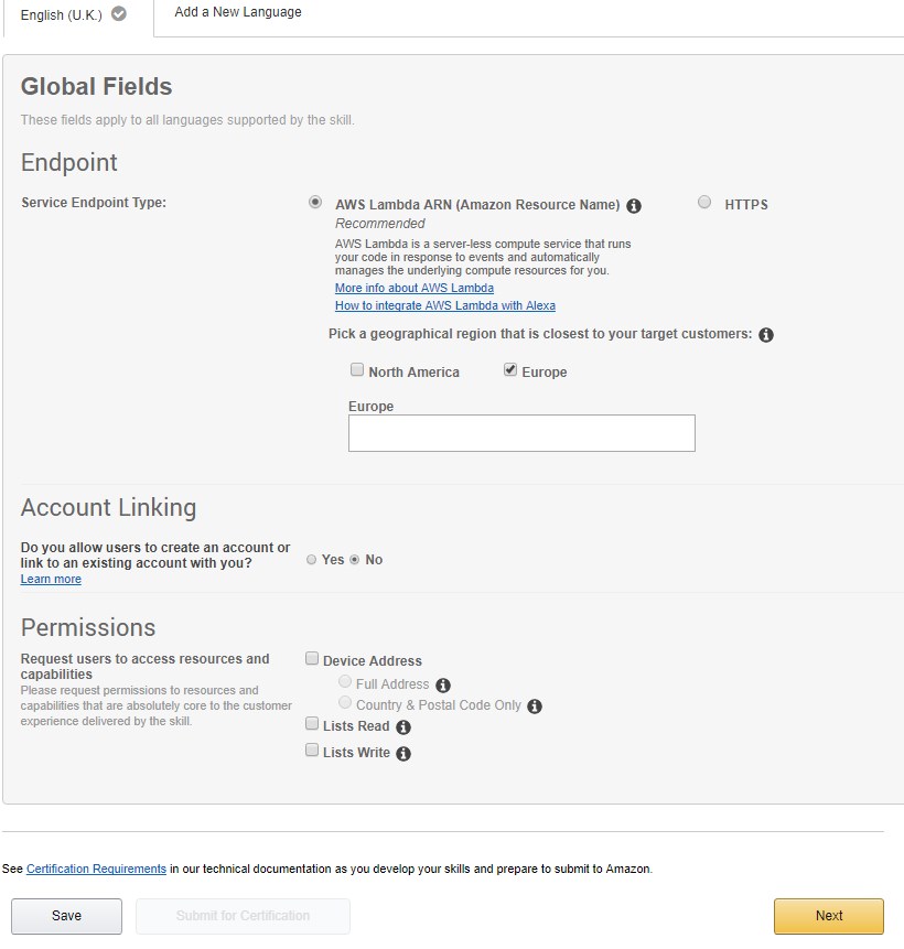 AWS Lambda is working (well kinda) now to hook up Alexa and begin to change the world. Now Alexa is not found within VS, instead you need to access it via the web portal so goto https://developer.amazon.com/edw/home.html#/skills. Once here you can click add a new skill and start the wizard process of building a basic skill. I chose custom skill with a language choice of UK provided and provided a name. One of the things you provide now is the Innocation Name (How Alexa knows its your skill the user wants to use). Choosing a good one of these I think could make or break your integration as it needs to be easier to say but distinct enough to be your skill. It's well worth reading the guidelines for help.